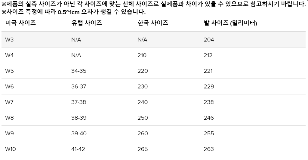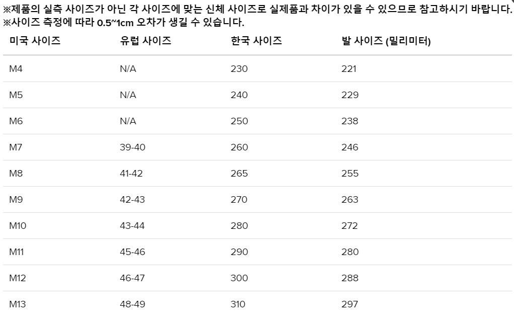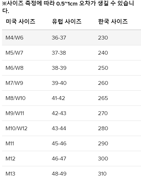 | 미국 사이즈 | 유럽 사이즈 | 한국 사이즈 |