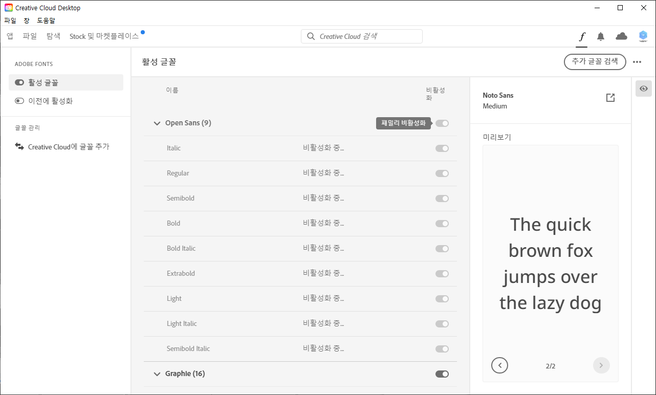 3. 활성글꼴을 모두 비활성화 해줍니다.